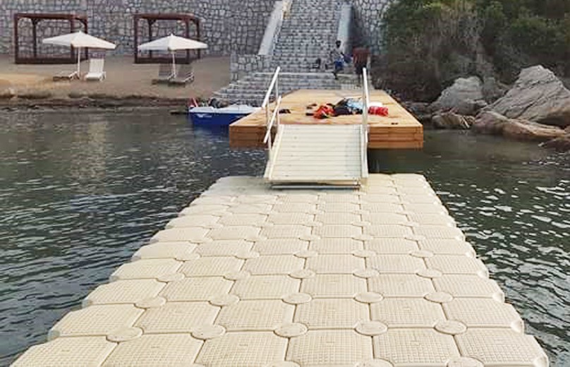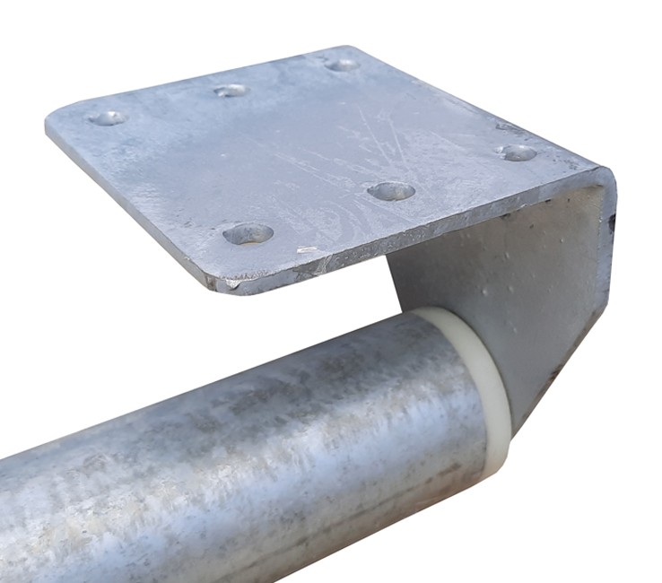 Rolle aus verzinktem Stahl, die unter dem Polyethylen-Steg befestigt wird, wenn er auf dem Ponton liegt.