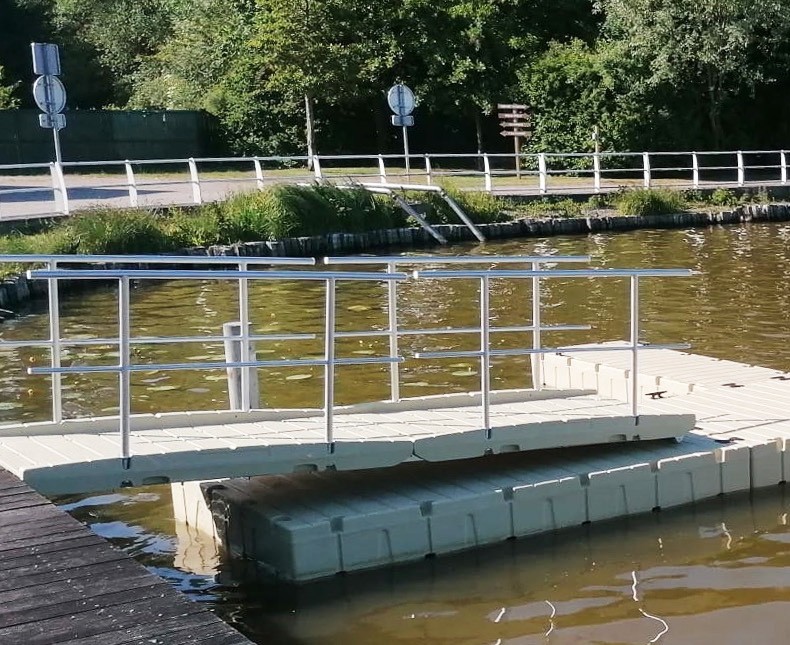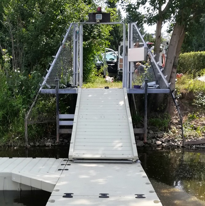 Dankzij de rol uit gegalvaniseerd staal aan het uiteinde van de loopbrug kan deze de schommelingen van het waterpeil en de bewegingen van uw steiger volgen.